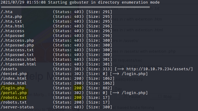 gobuster -m dir -u http://10.10.79.234 -w /usr/share/wordlists/dirb/common.txt -x php,txt,htmlThis command lets gobuster scan in “directory” mode. We use a wordlist from dirb (an application similar to gobuster), because gobuster on Kali does not have its own wordlist. The -x option allows us to only search for certain file extensions.