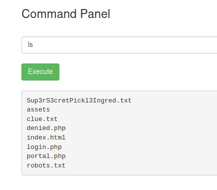 The ingredient is right there, and we can try to open it with the command cat Sup3rS3cretPickl3Ingred.txt, however, it fails. Certain commands are disabled.