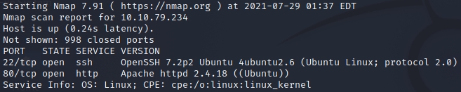 nmap -sV 10.10.79.234The results show that SSH is open, and that there is a webserver.